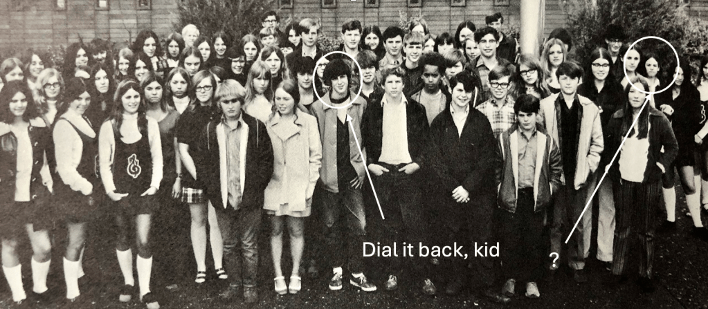 The photograph is of the “Ninth Grade Honor Society” at Rincon Valley Junior High in…oh, I don’t know… probably the Fall of 1971.  The guy in the front with the attitude…the one I want to smack upside his head…that’s me. The one in the back who looks maybe a little miffed? That’s Cathy.