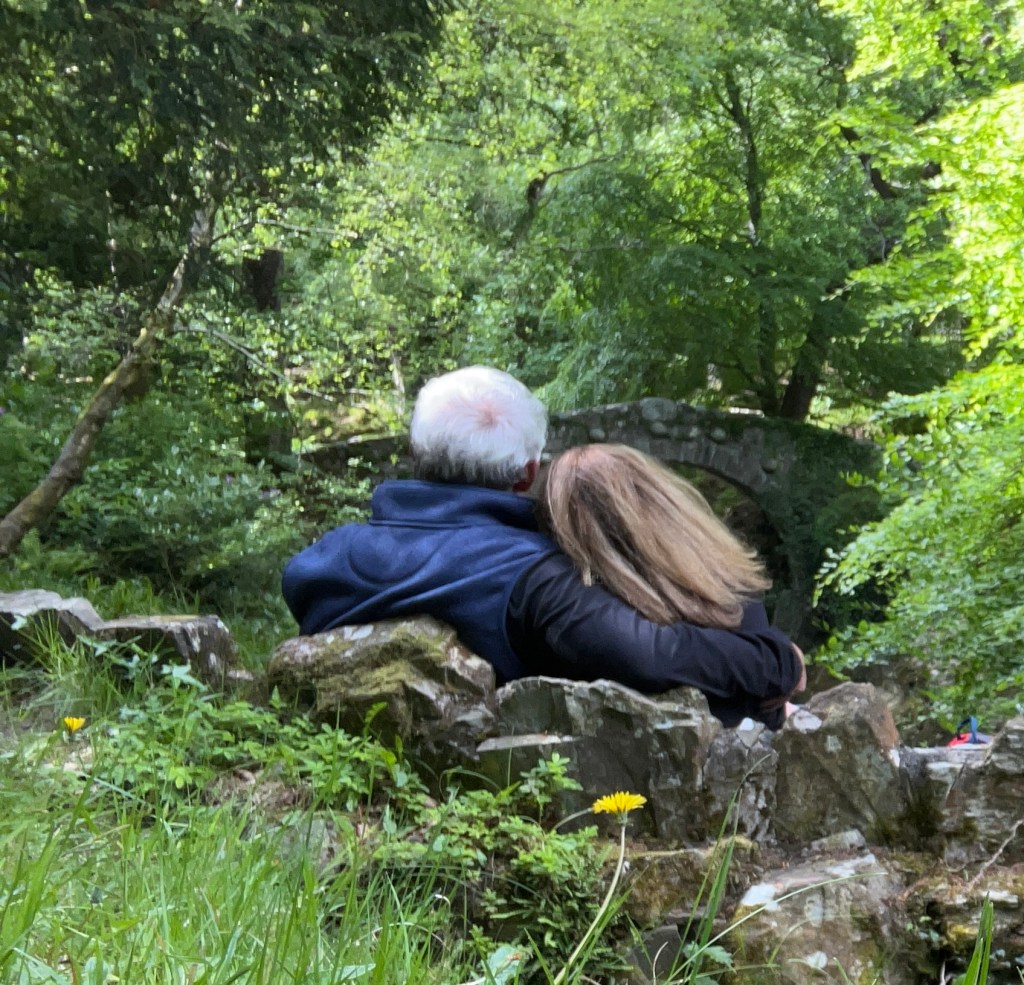 When Cathy and I eloped to Northern Ireland, we went for a hike along a stream in the Tollymore Forest west of Newcastle. It was a magical walk with ancient yew trees, and arched 18th century stone footbridges spanning the fast-moving water flowing from the Mourne Mountains to the Irish Sea.