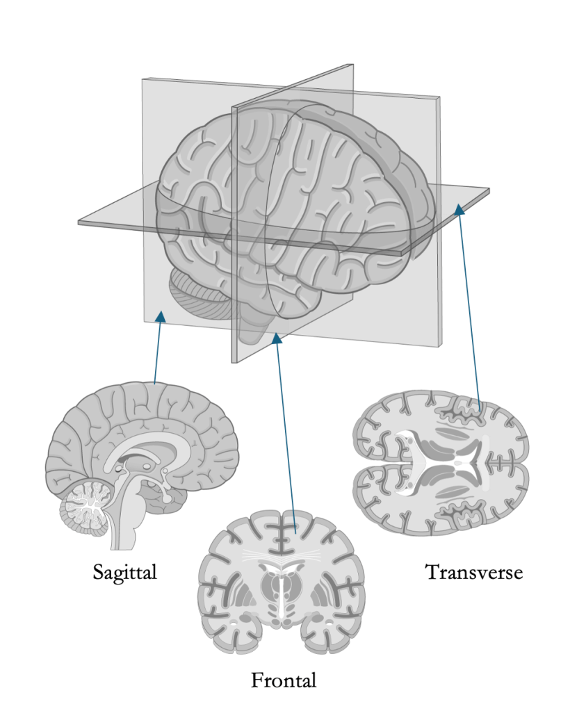 Imagine you sliced a brain open to look inside. You could do that three ways. These are what your anatomical wizards call “sectional planes.”