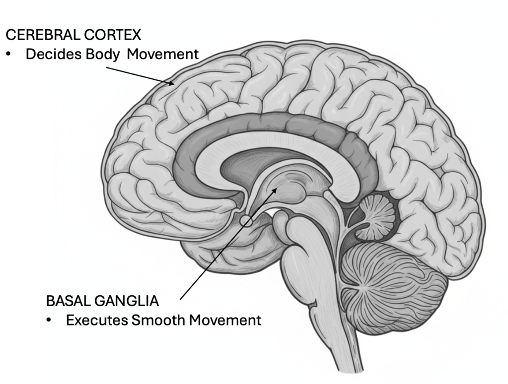 The one function you may not think about…because you’re thinking about that four-letter word… is movement. Our brains control how we move.The control room for movement in the brain is the basal ganglia. It is the size of a gum ball. You have two of them. The right basal ganglia controls the left side of your body; the left basal ganglia controls the right side of your body. (Don’t ask; makes no sense to me either.) Both are located deep in the brain.