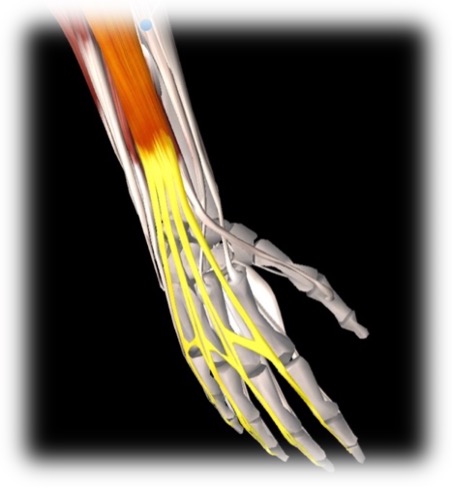 The basal ganglia directs all those muscles at once to do different things. But, for our purposes, let’s focus on just one. Let’s say, the branches of the extensor digitorum in your right hand.