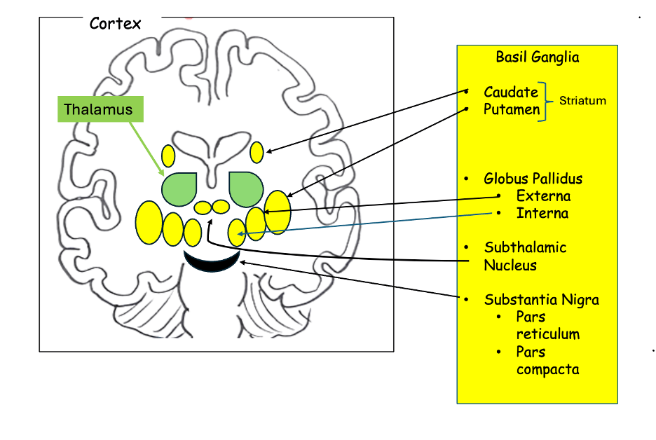 This is where it gets tricky. We need to know the parts of the basal ganglia. Here they are: