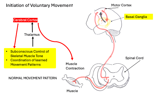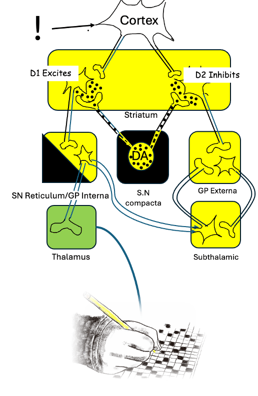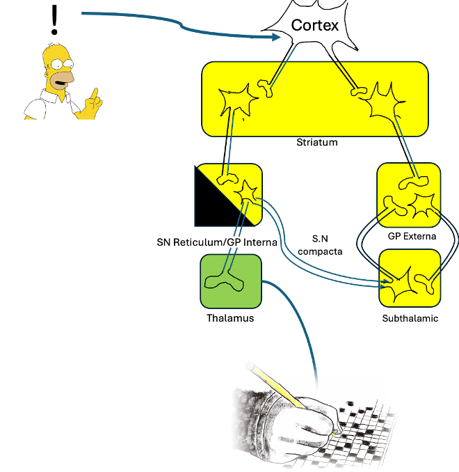 Now, I won’t get too far into the weeds, but let me take a stab at explaining how these parts of the Basil Ganglia convert an idea into smooth muscle movement.